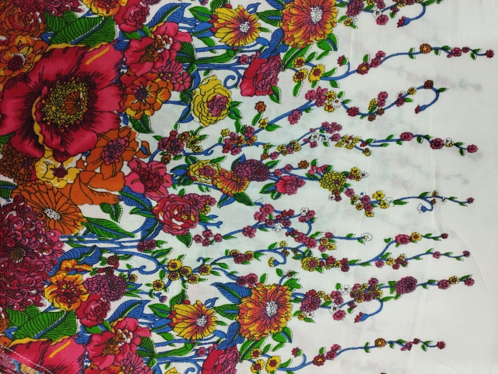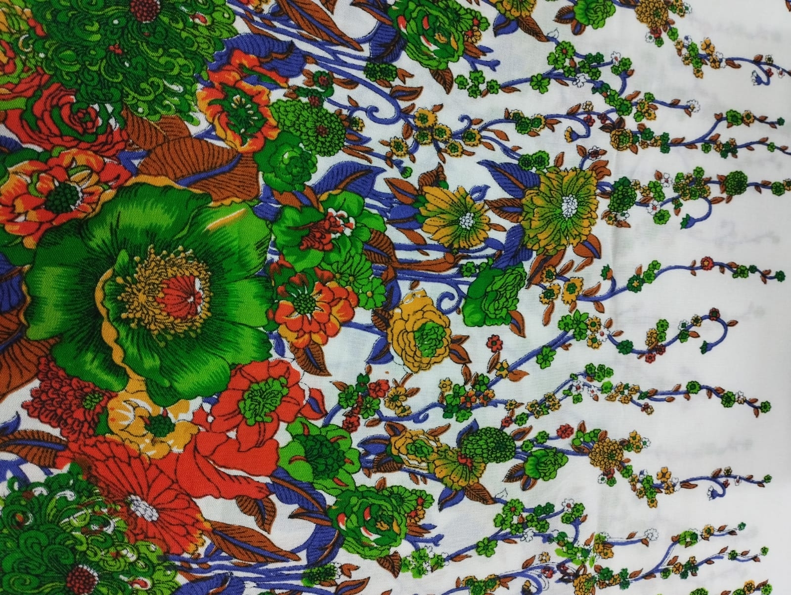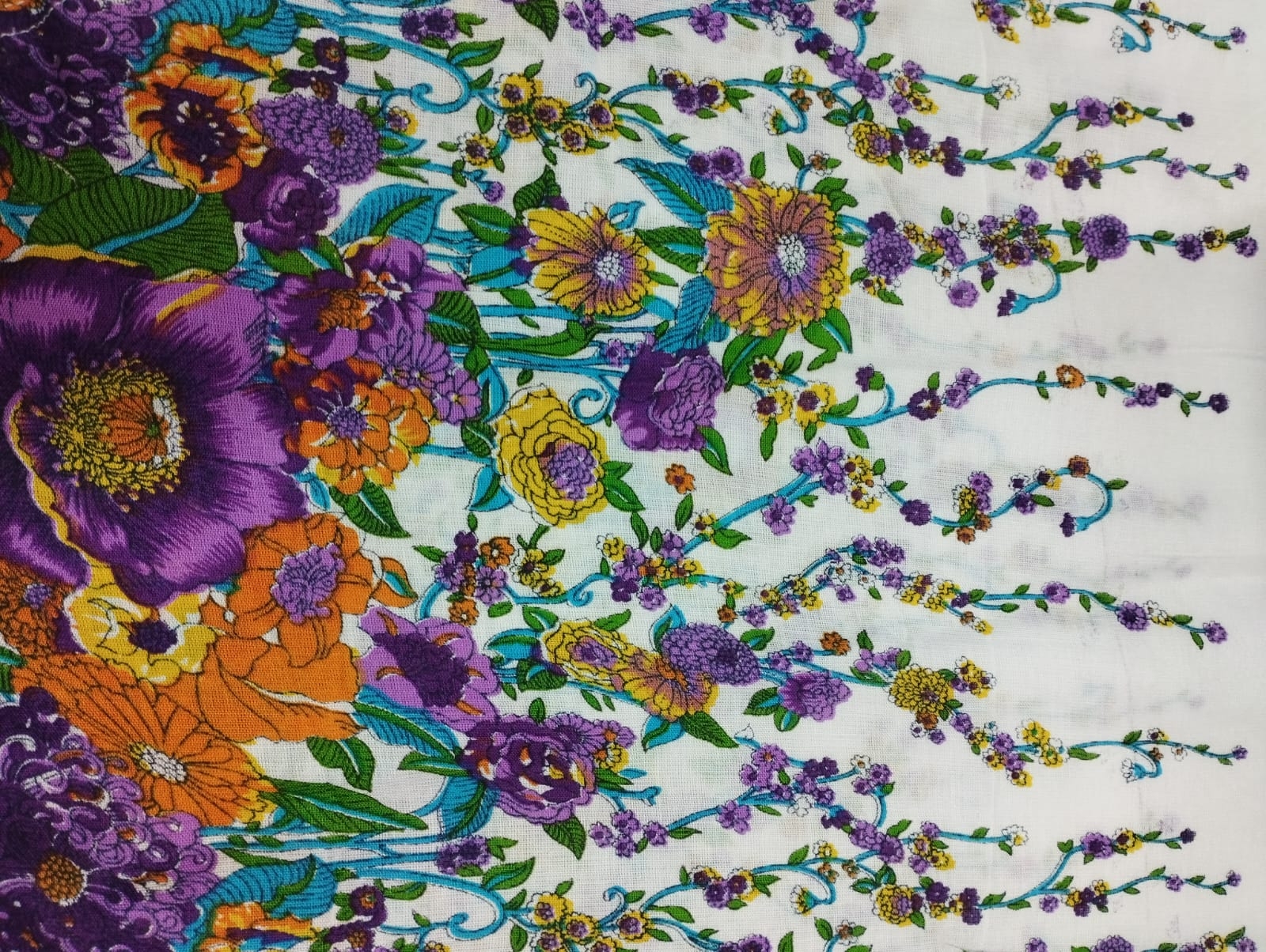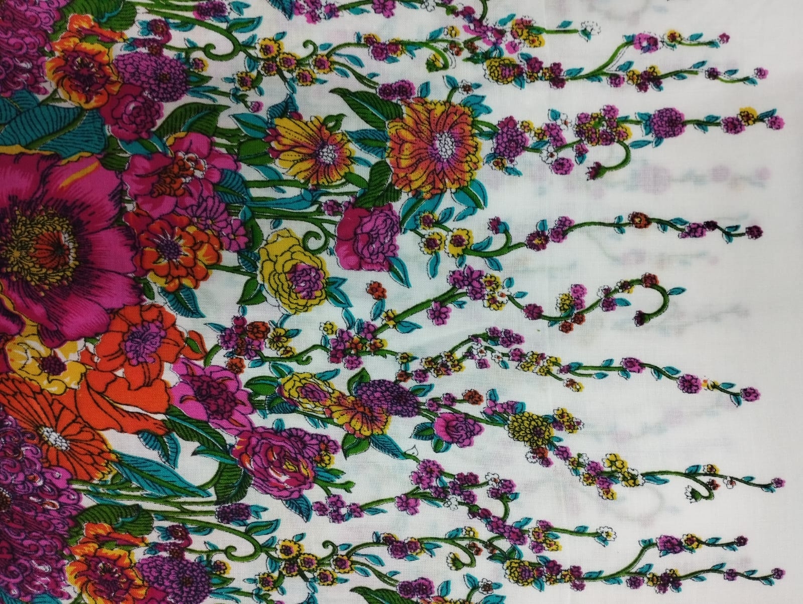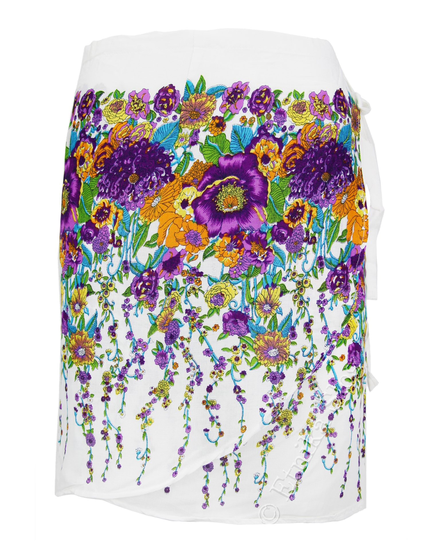 LONG SKIRT IN LIGHTWEIGHT INDIAN COTTON, WITH AN ELASTIC BAND AT WAIST, WITH VOLANTS.FEATURING A FLOWER PRINT, AS SHOWN IN THE PHOTOS.ONE SIZE.
