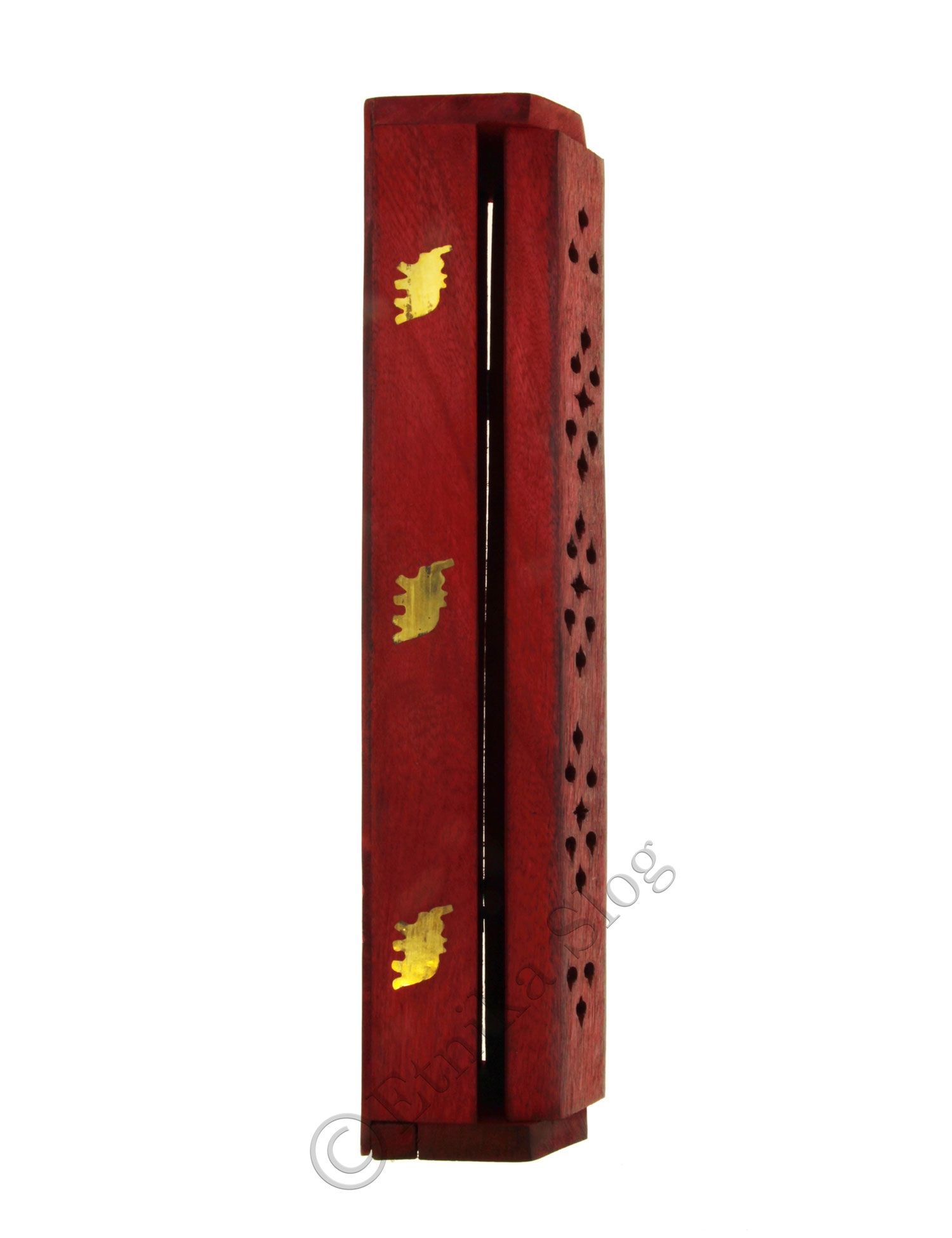 WOODEN INCENSE HOLDER, LARGE TRUNK WITH BRASS MOTIVE APPLIED, PERFORATED.