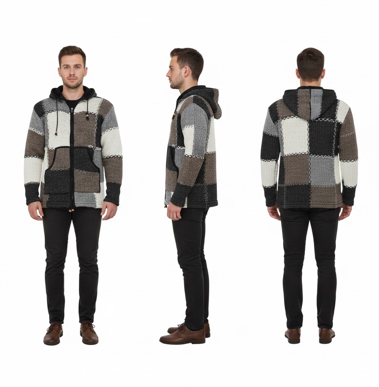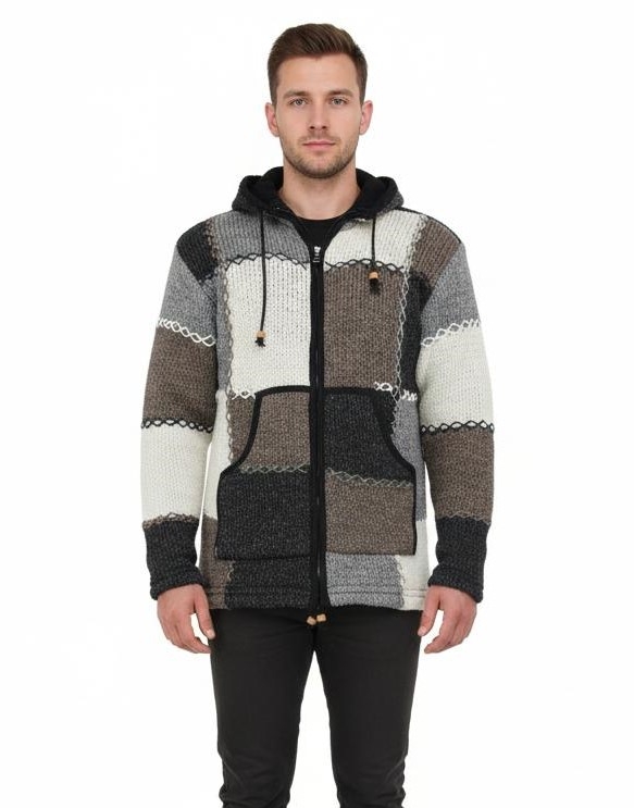 COSY WOOLLEN WINTER JACKET, FULLY LINED, WITH REMOVABLE HOOD AND SIDE POCKETS.