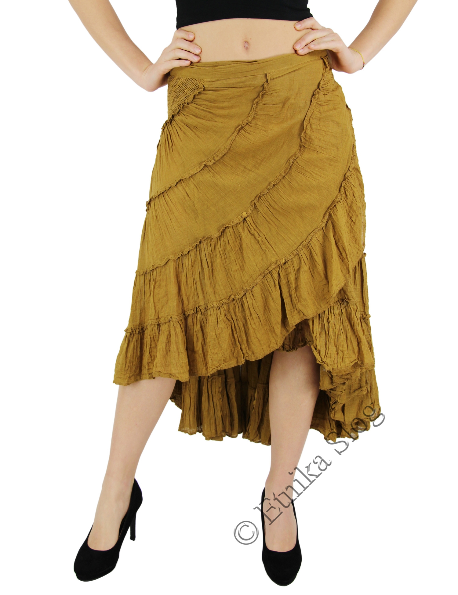 LONG SKIRT WITH LACES FOR ADJUSTABLE SIZE, DIAGONAL WITH FLOUNCES. MADE OF RAW ORGANIC COTTON WITH HANDMADE PRINTS IN NATURAL COLORS.