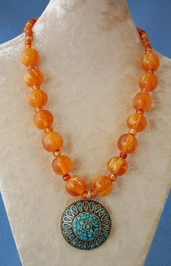 COLLANA DI PERLE DISEGNATE IN RESINA E VETRO CON PENDENTE IN OTTONE E RESINA.