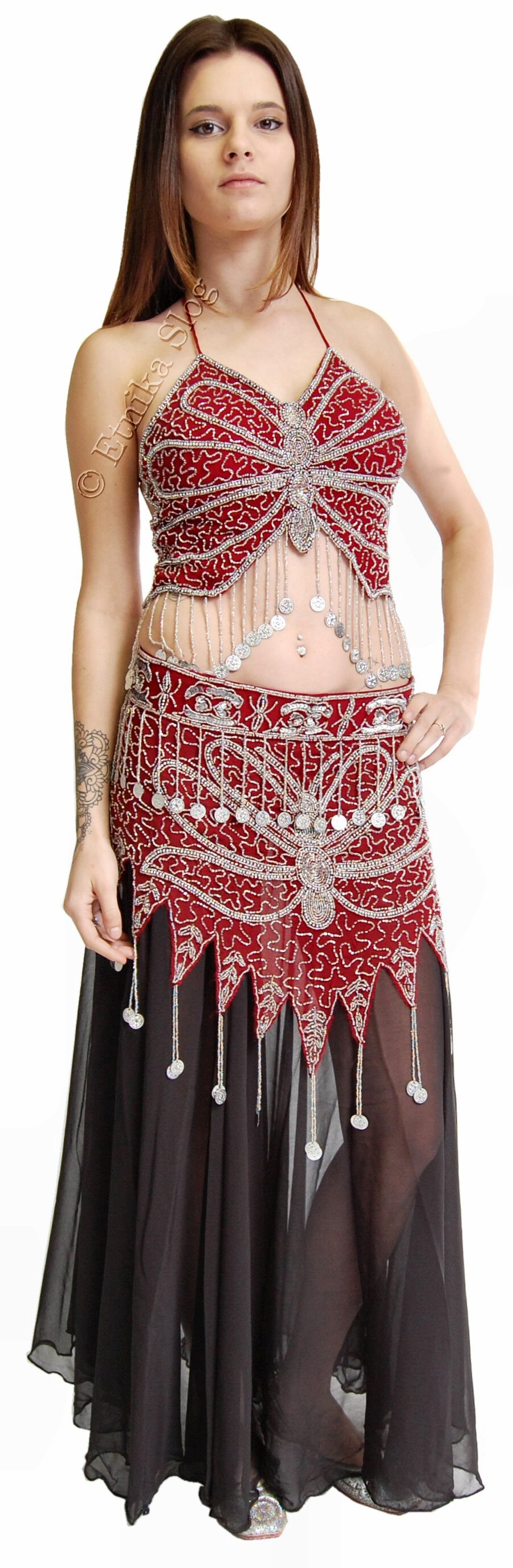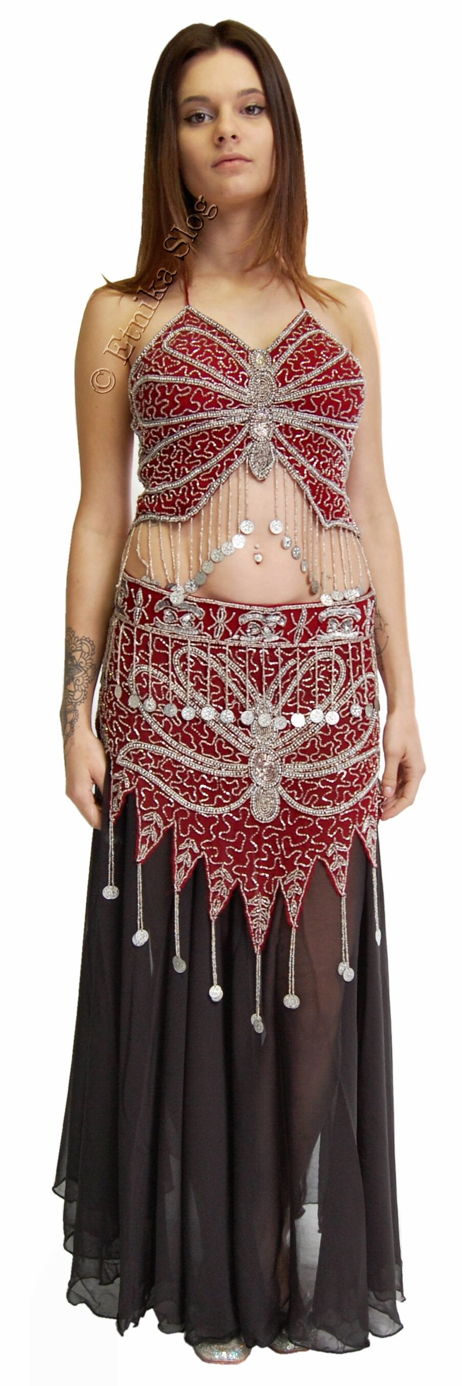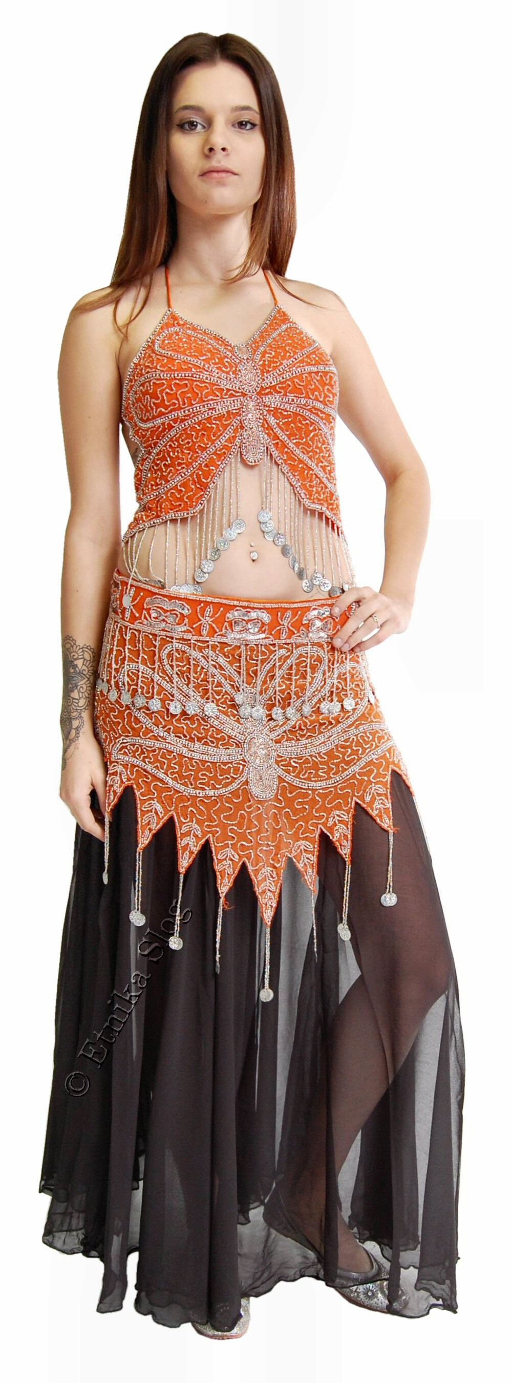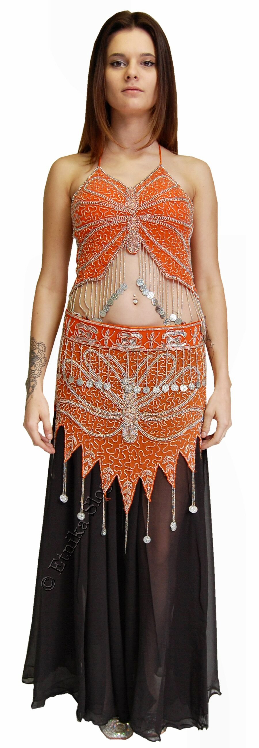 SET DANZA DEL VENTRE TOP E PAREO CON FARFALLA GRANDE RICAMATA CON PERLINE GROSSE.