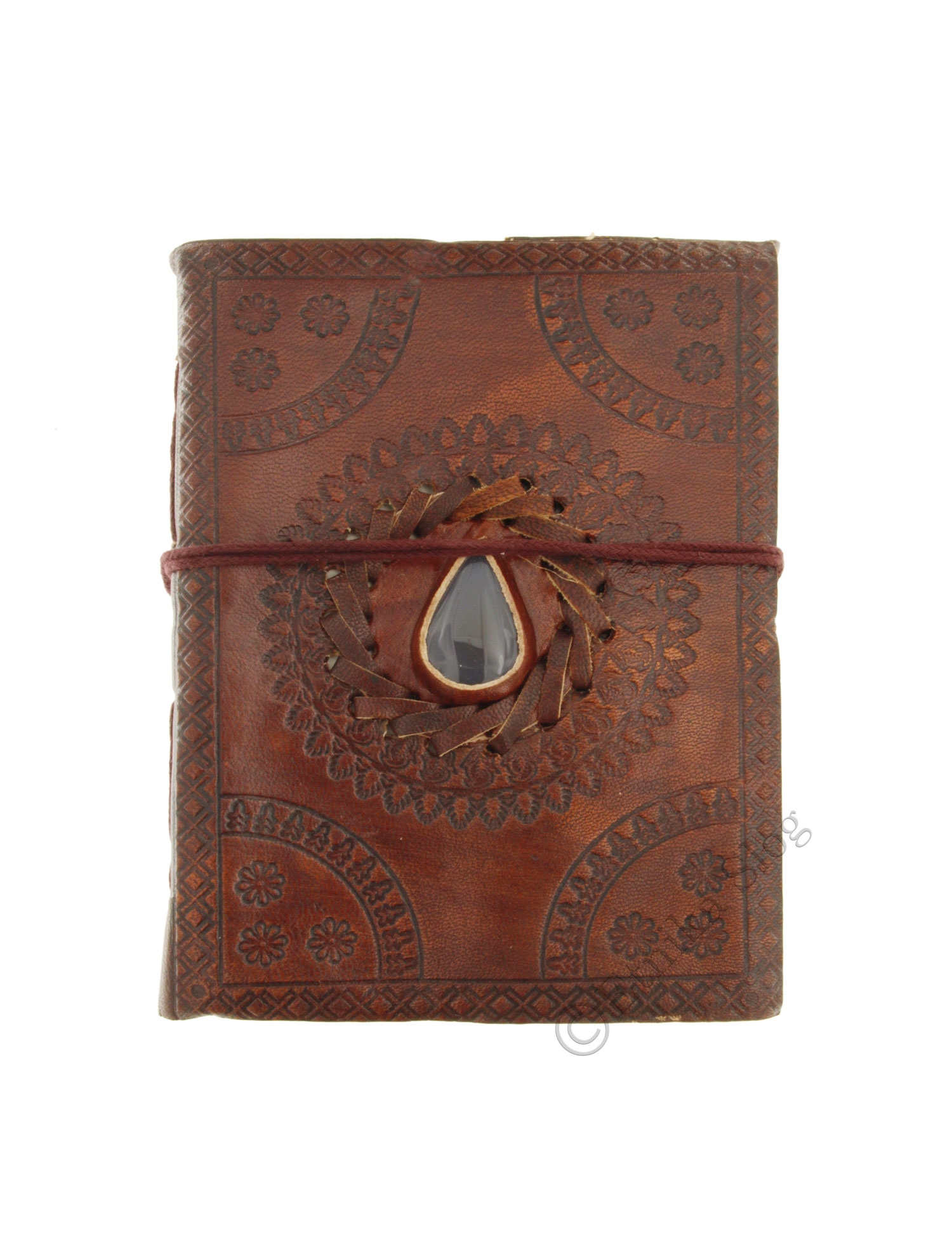 LIBRO RILEGATO IN PELLE DI QUALITA, CON FOGLI CARTA NORMALE.CON PIETRA INCASTONATA, CHIUSURA CON CORDONCINO IN PELLE.DIMENSIONI 13 X 18 CM- ACCHIAPPASOGNI, PIETRE ASSORTITE -