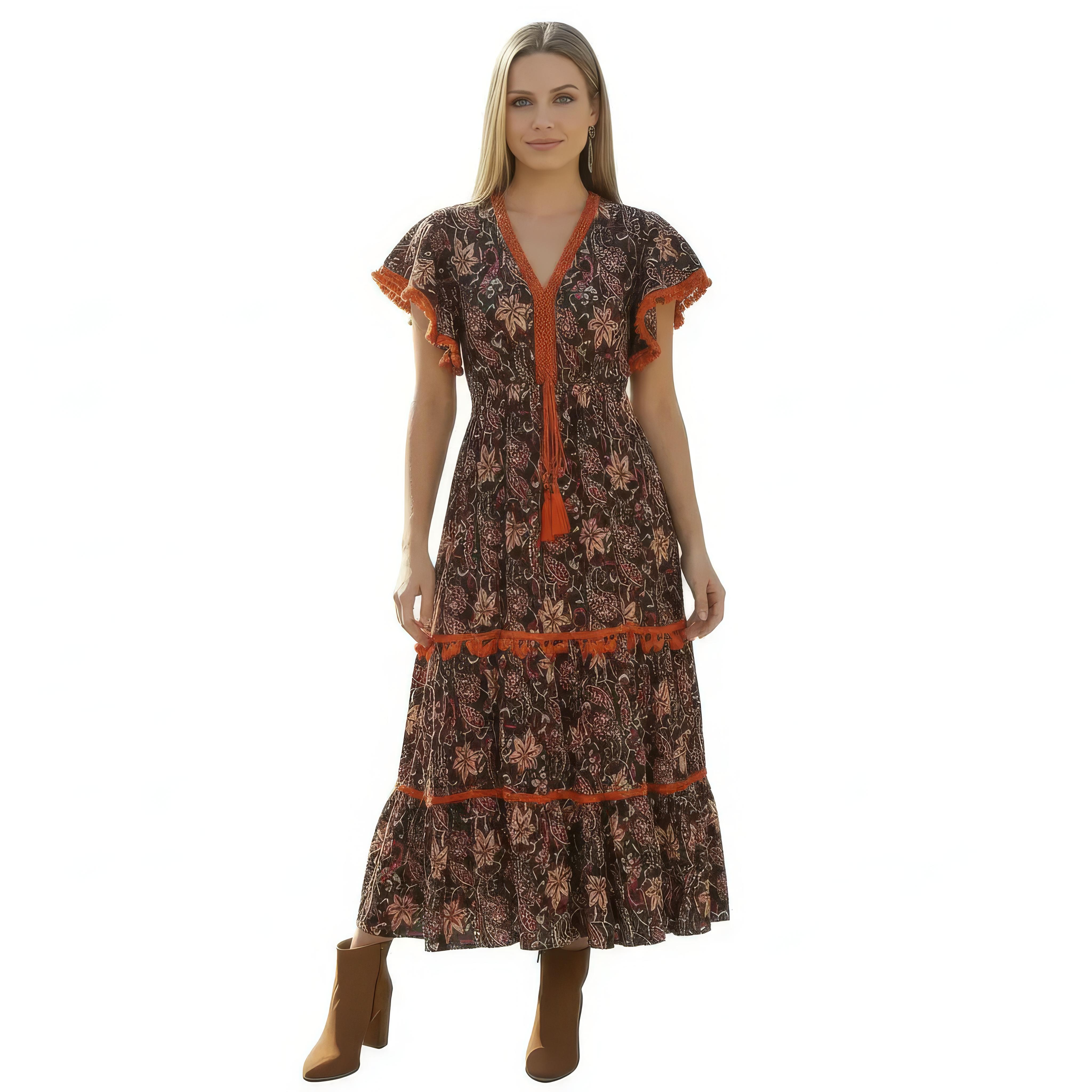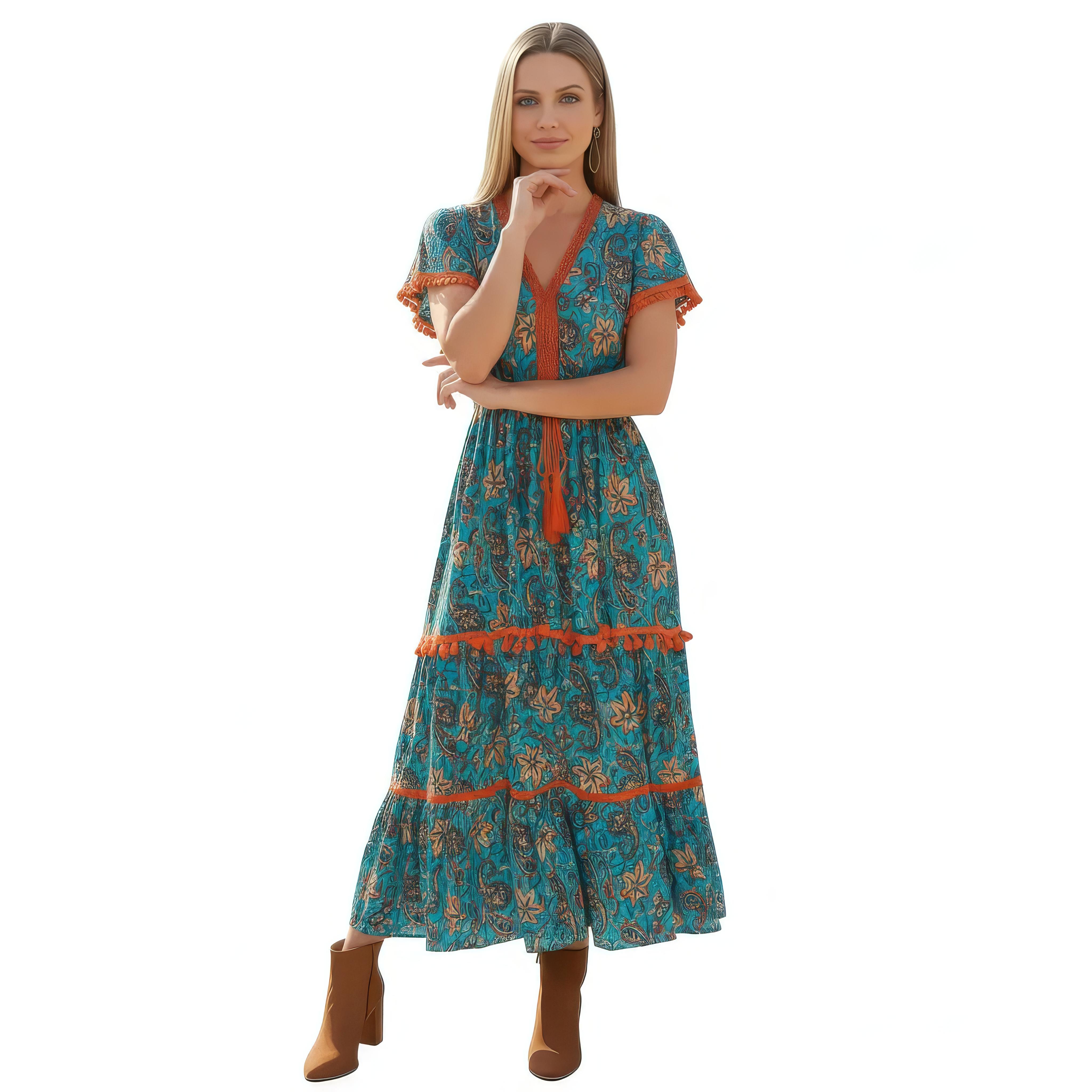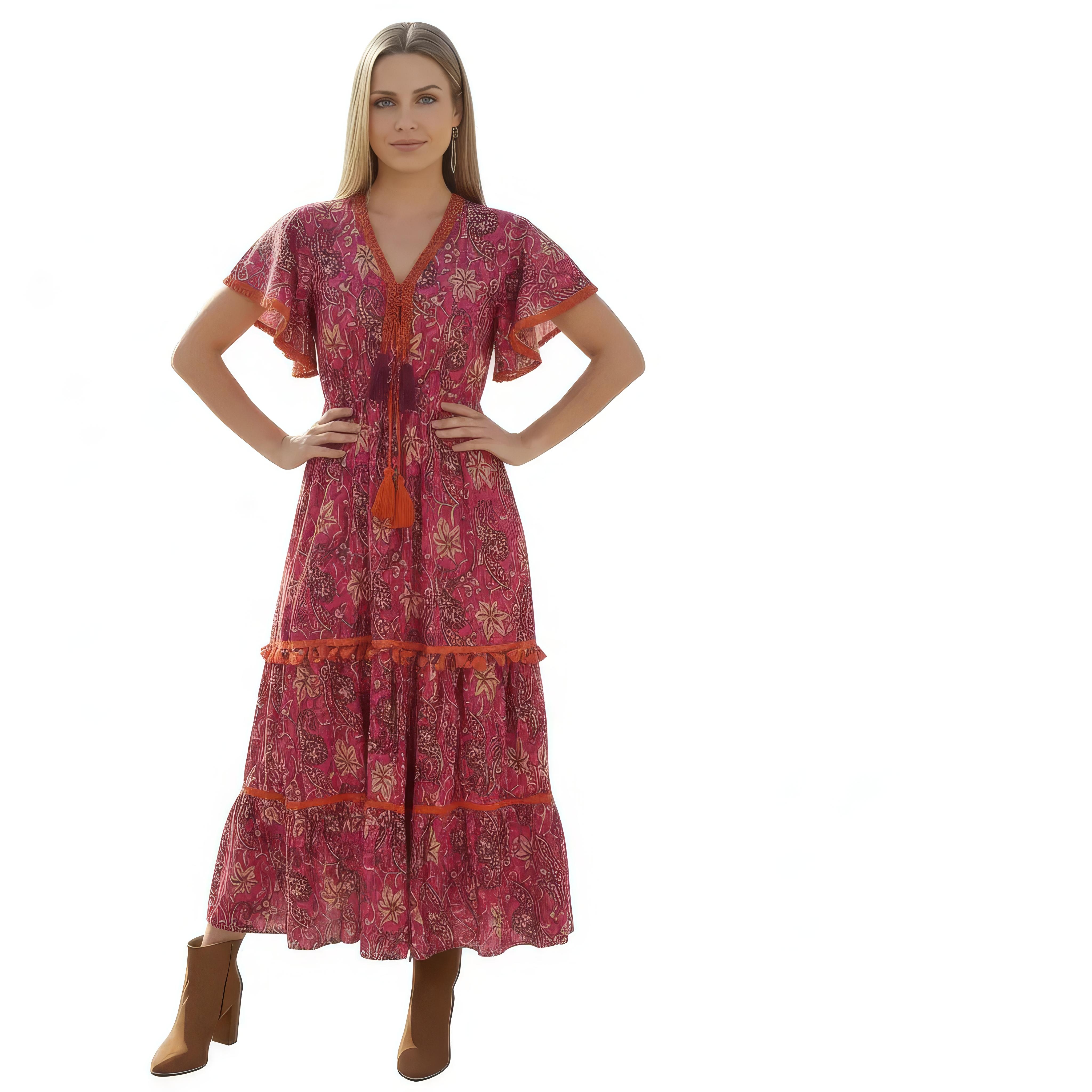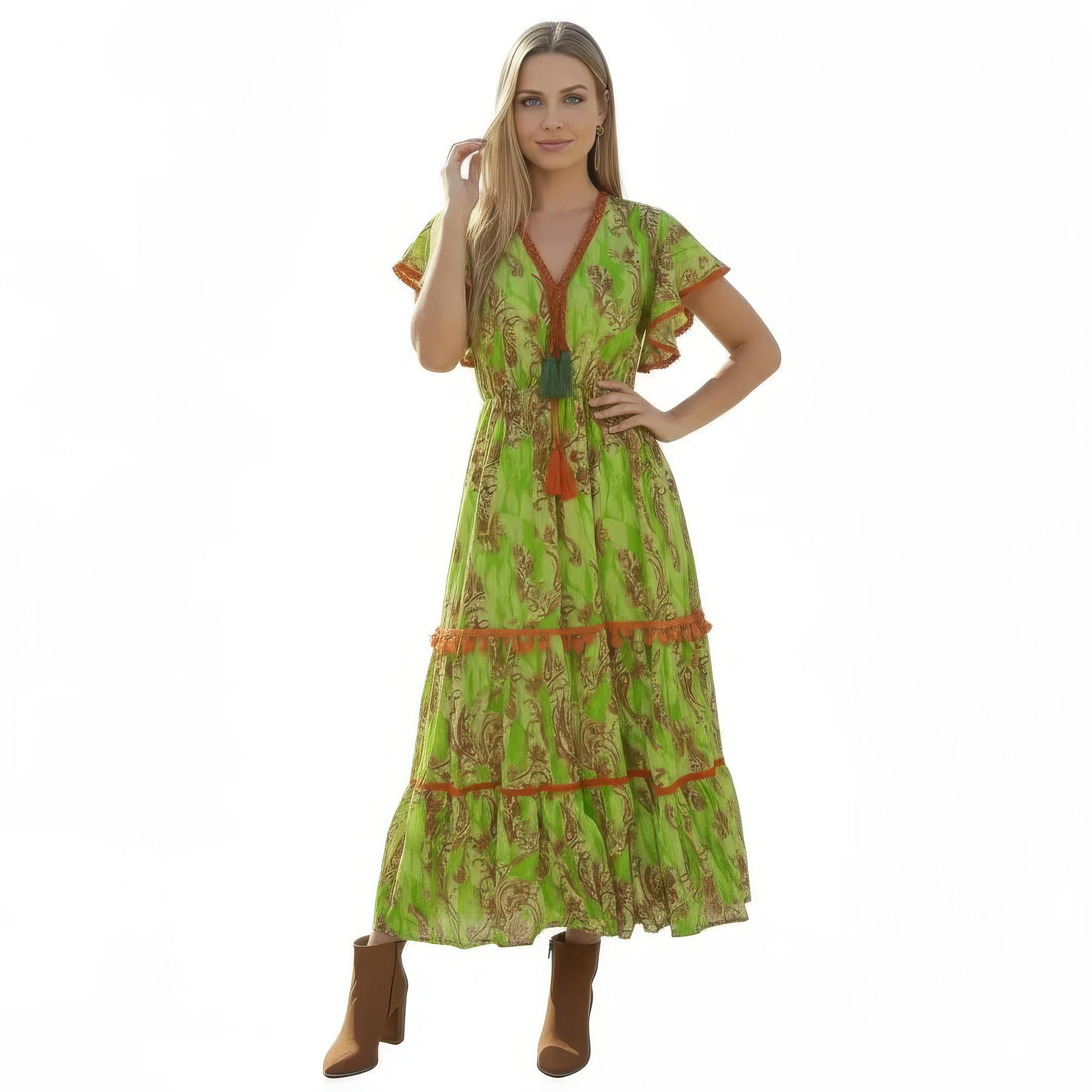 VESTITO LUNGO IN VISCOSA STAMPATA, CON FILO LUREX ORO.