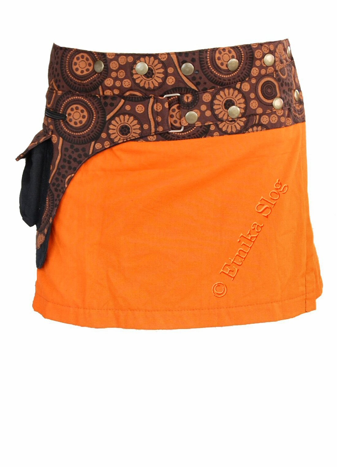 MINI GONNA IN COTONE TINTA UNITA CON FASCIA FANTASIA MISTE, CON MARSUPIO, REGOLABILE CON BOTTONI A PRESSIONE.