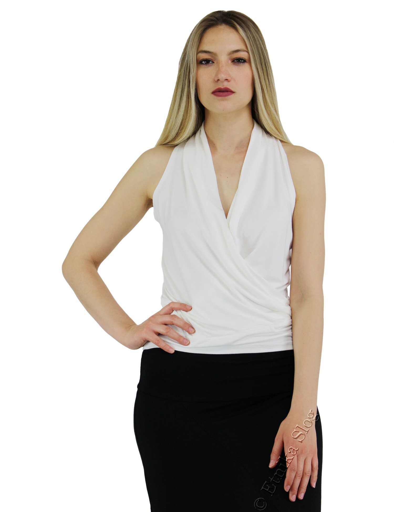 TOP IN MAGLINA DI COTONE, VISCOSA ED ELASTAN. TINTA UNITA, SPALLINA MEDIA , INCROCIATO DAVANTI ED ELASTICO IN VITA.