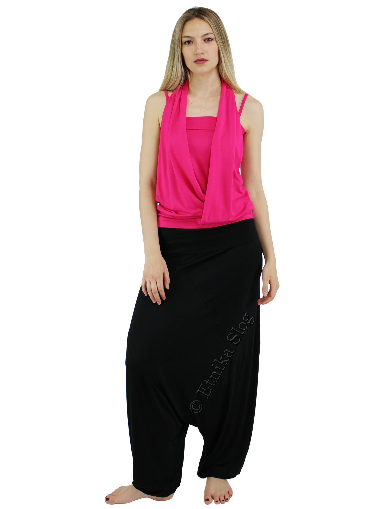 TOP IN MAGLINA DI COTONE, VISCOSA ED ELASTAN. TINTA UNITA, SPALLINA STRETTA , INCROCIATO DAVANTI ED ELASTICO IN VITA.