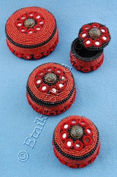 OKROGLA ŠKATLICA IZ BLAGA IN OGLEDALC TER DODATKOV, S POKROVOM Z GUMBOM IZ MEDENINE.