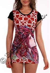 ZANIMIVA OBLEKA S KRATKIMI ROKAVI, POTISKAN VZOREC NA SPREDNJI STRANI.