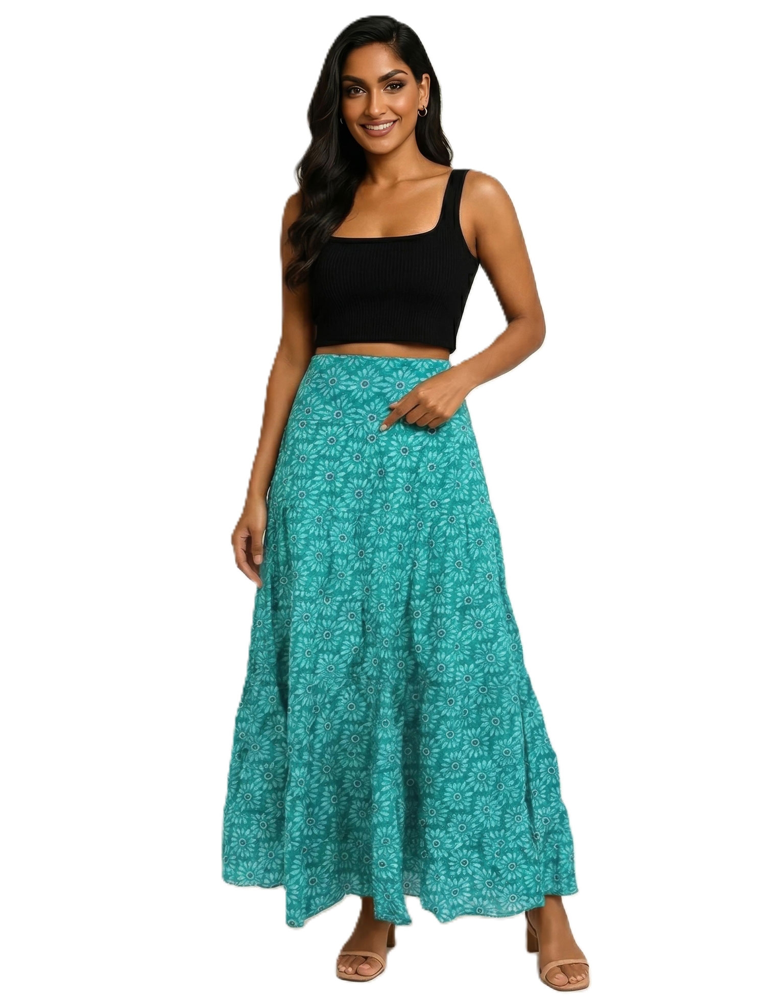 DOLGO KRILO IZ LAHKEGA INDIJSKEGA BOMBAŽA, Z ELASTIČNIM PASOM, Z VOLANČKI.Z MOTIVOM CVETOV, KOT NA SLIKI.UNIVERZALNA VELIKOST.