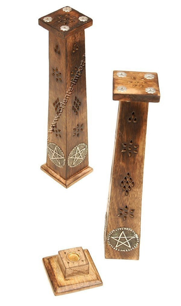 DRŽALO ZA KADILO V OBLIKI STEBRA, KVADRATEN, PERFORIRAN LES STARINSKEGA IZGLEDA Z KOVINSKIM VSTAVKOM.