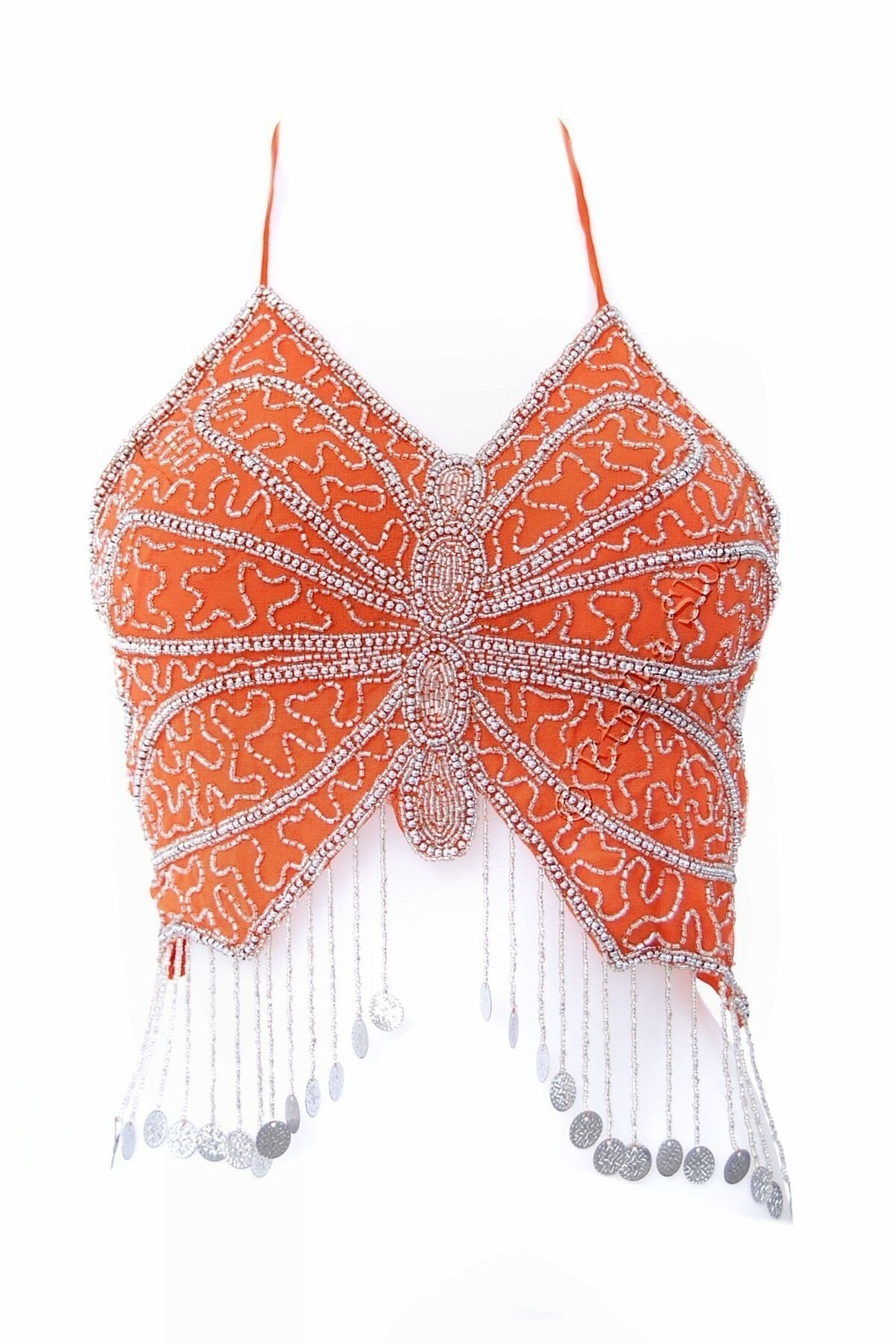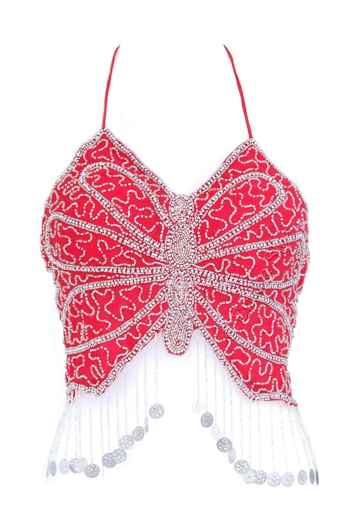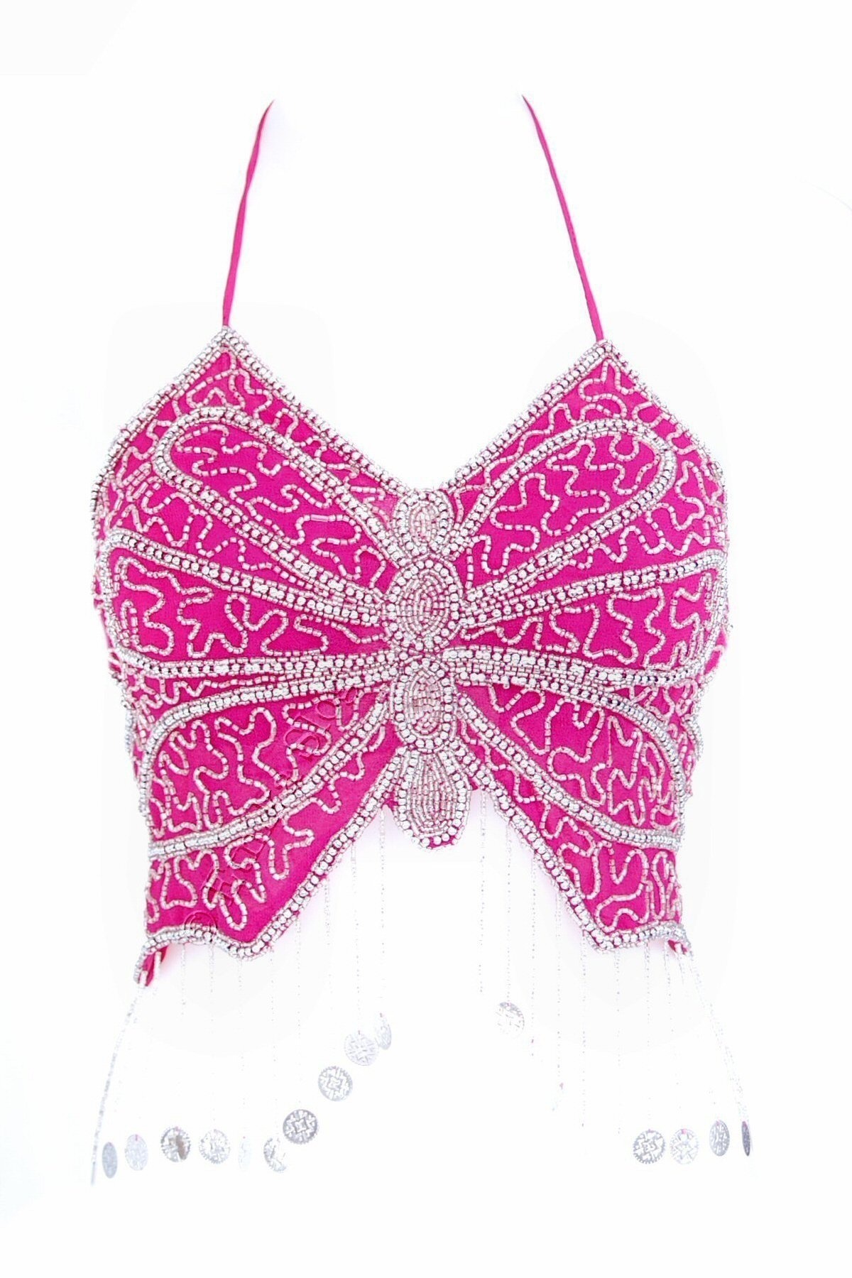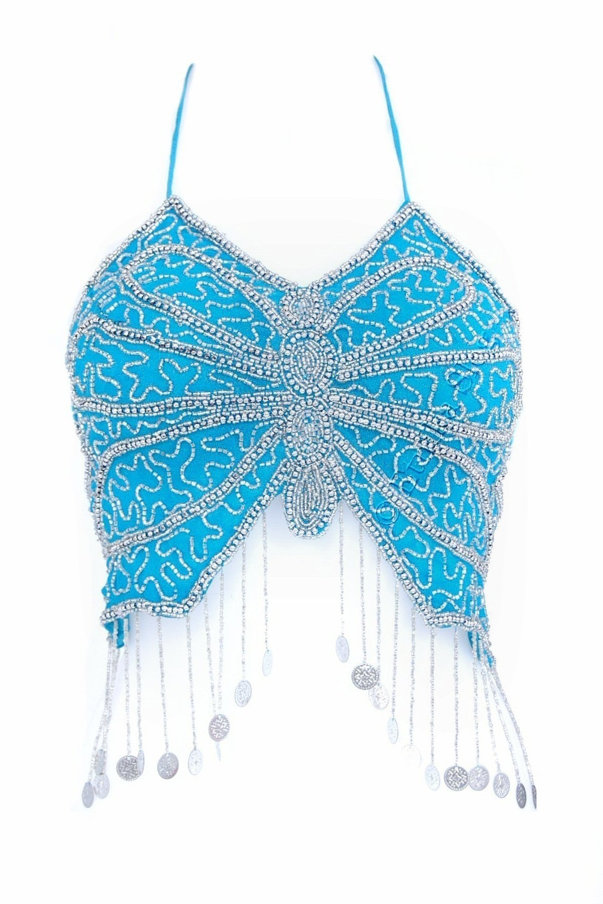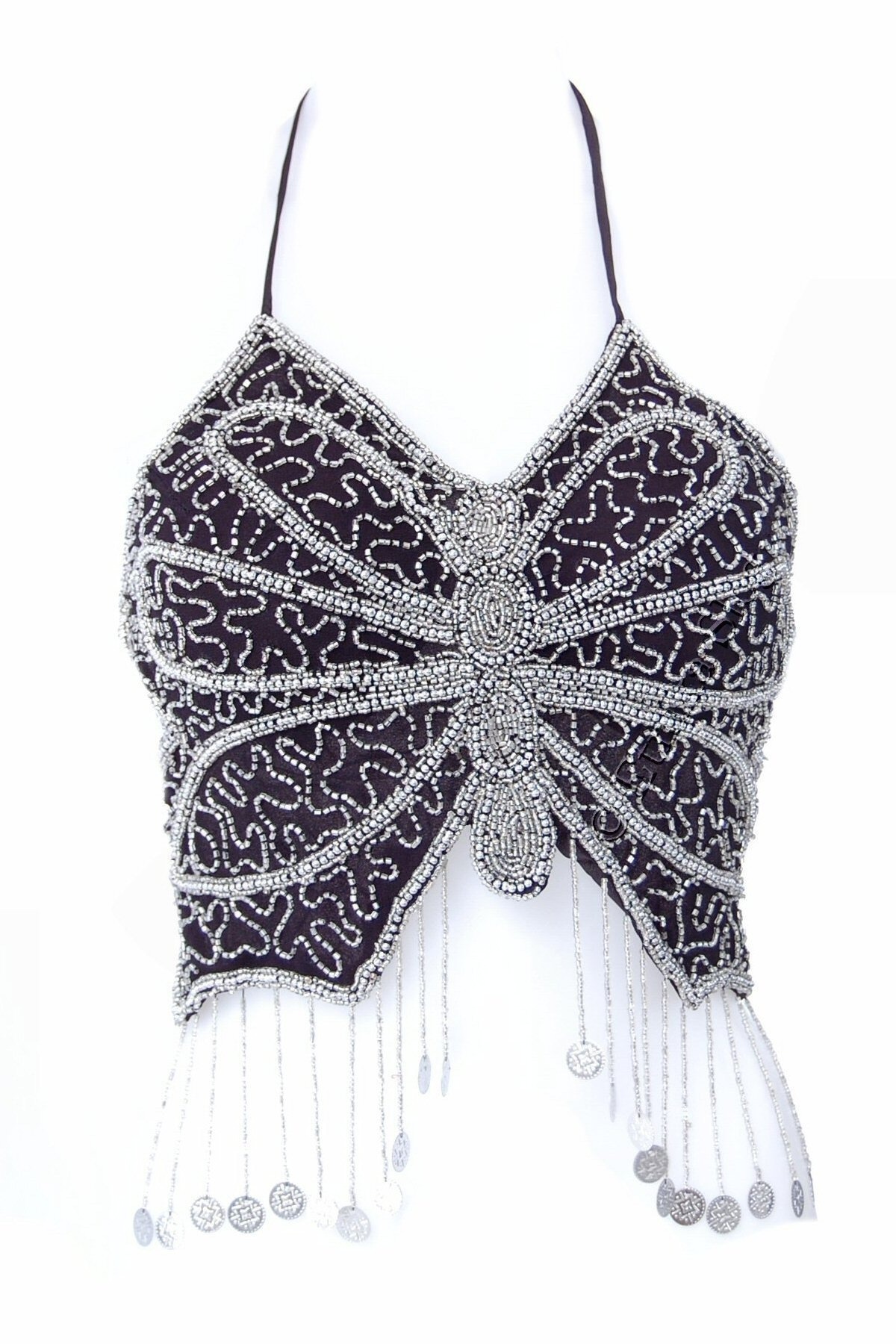 TOP ZA TREBUŠNI PLES V OBLIKA METULJA, S VŠITIMI PERLICAMI TER SREBRNIMI MEDALJONČKI.