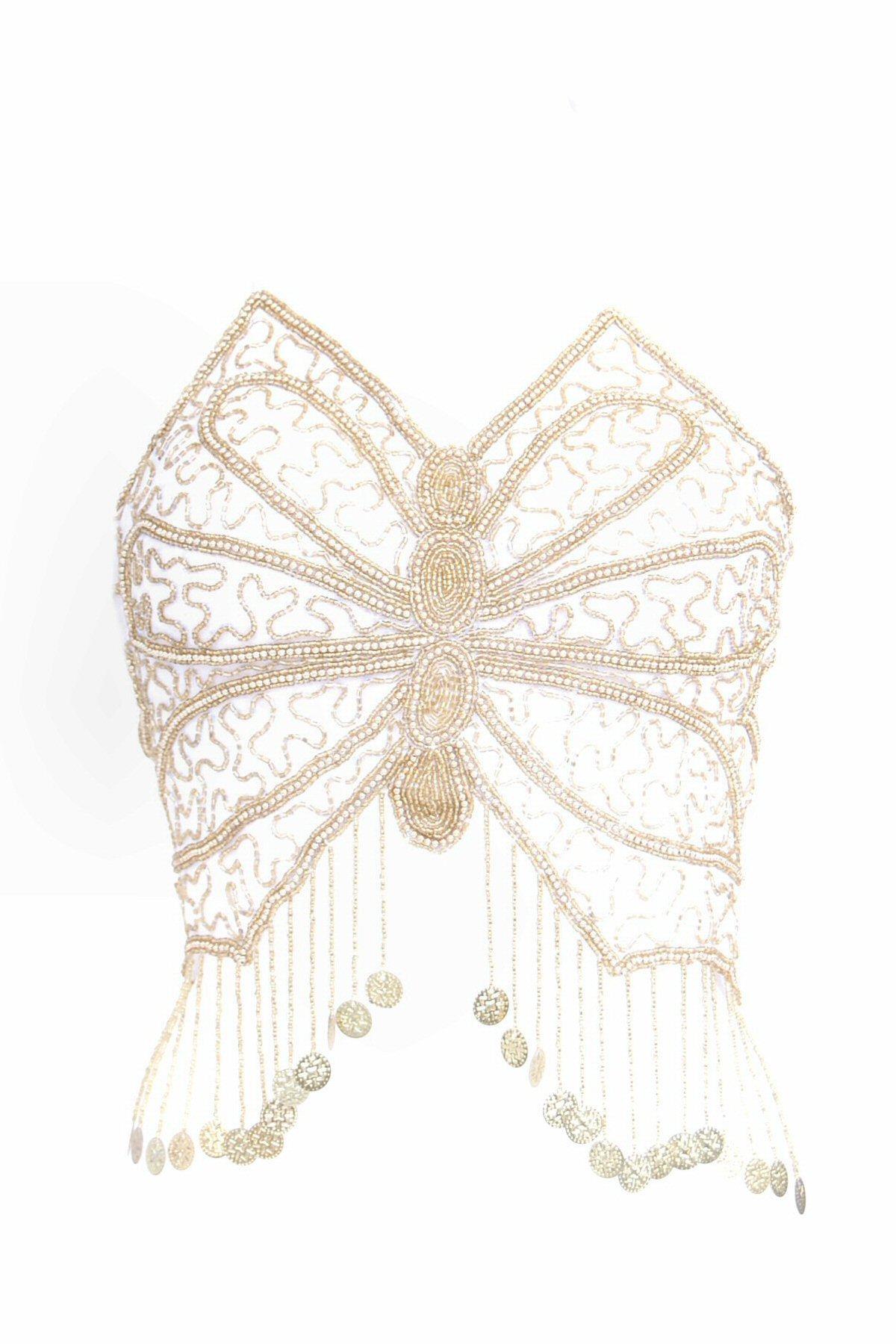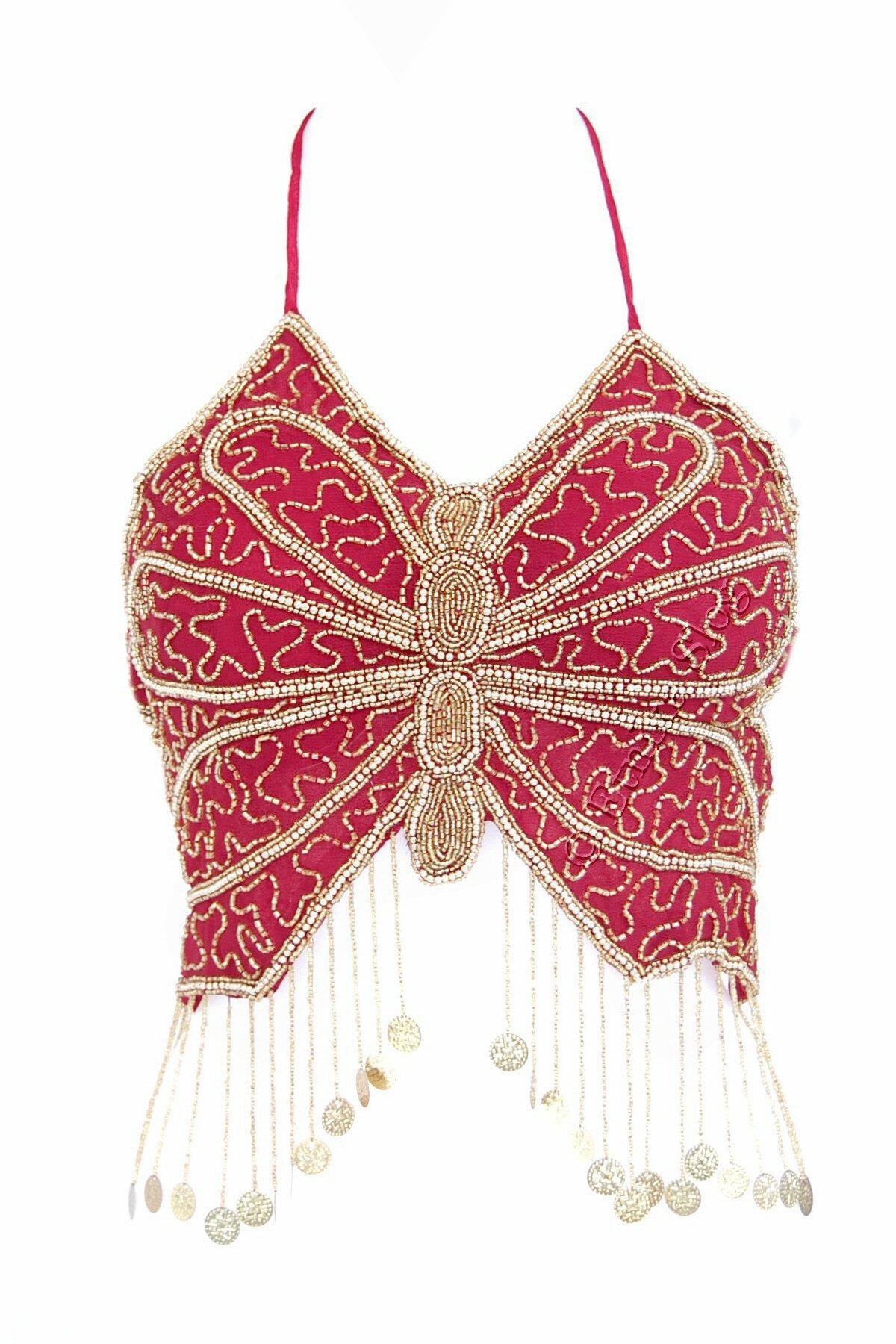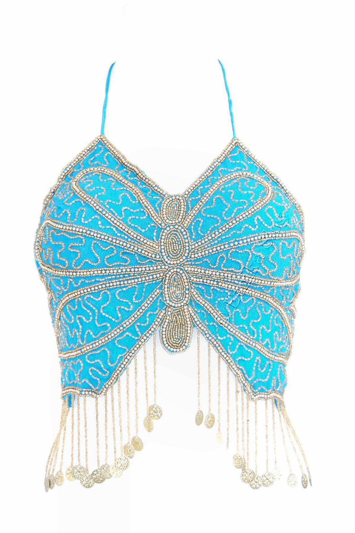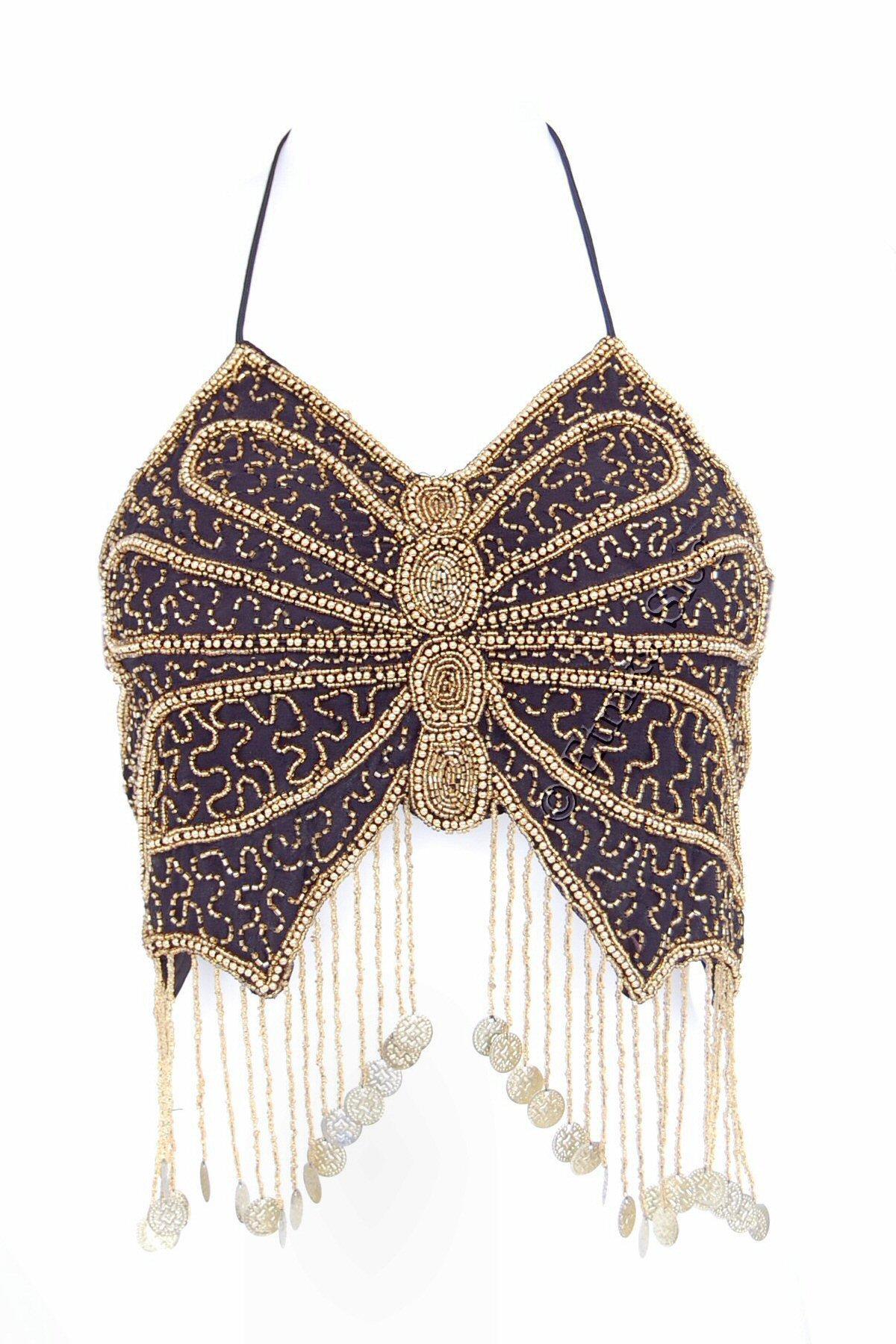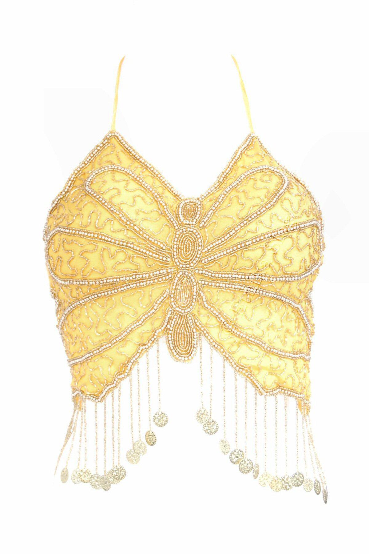 TOP ZA TREBUŠNI PLES V OBLIKA METULJA, S VŠITIMI PERLICAMI TER ZLATIMI MEDALJONČKI.