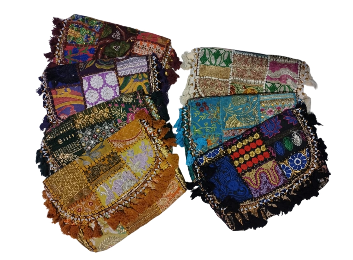 MAJHNA PRAVOKOTNA BOMBAŽNA TORBICA ZA NA RAMO S SARI VEZENINAMI IN OGLEDALCI.