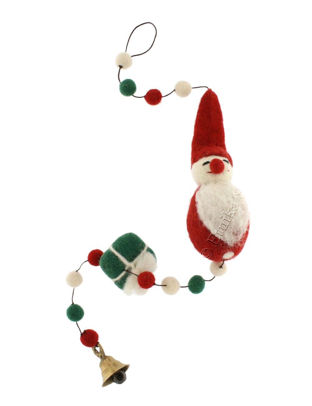 VISEČI BOŽIČNI OKRASEK Z BOŽIČKI IN KROGLICAMI IZ FILCA TER ZVONČKOM.